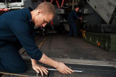 | Keywords: USS Mobile Bay 130107-N-LV331-128.jpg en Engineman 2nd Class Zachary Quinones of Portland Ore removes a track plate to the hangar bay door aboard the Ticonderoga-class guided-missile cruiser USS Mobile Bay CG 53 in preparation to transport an MH-60R Seahawk helicopter to the flight deck Mobile Bay is deployed with the John C Stennis Strike Group to the U S 5th Fleet area of responsibility conducting maritime security operations theater security cooperation efforts and support missions for Operation Enduring Freedom U S Navy photo by Mass Communication Specialist 2nd Class Armando Gonzales/Released 2013-01-07 Armando Gonzales https //www dvidshub net/image/812336 130107-N-LV331-128 2013-01-10 13 30 USS MOBILE BAY AT SEA PD-USGov-Military-Navy MH-60R Seahawk Operation Enduring Freedom USS Mobile Bay CG-53 Images from DoD uploaded by Fæ |