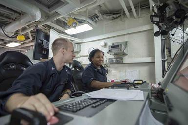 | Keywords: USS Normandy (CG 60) deployment 150830-N-ZY039-027.jpg en 150830-N-ZY039-027 ARABIAN GULF Aug 26 2015 Machinist's Mate 2nd Class Dillion Calvert left from Tampa Bay Fla and Gas Turbine Systems Technician Mechanical 2nd Class Amina Raheem from Fayetteville N C stand watch in the Central Controlling Station aboard the guided-missile cruiser USS Normandy CG 60 Normandy is deployed to the U S 5th Fleet area of operations as part of Theodore Roosevelt Carrier Strike Group supporting Operation Inherent Resolve strike operations in Iraq and Syria as directed conducting maritime security operations and theater security cooperation efforts in the region U S Navy photo by Mass Communication Specialist 3rd Class Justin R DiNiro/ Released <br>Unit Navy Media Content Services 2015-08-30 Petty Officer 3rd Class Justin DiNiro https //www dvidshub net/image/2154533/uss-normandy-cg-60-deployment 150830-N-ZY039-027 2015-09-02 02 42 USS NORMANDY PERSIAN GULF PD-USGov-Military-Navy USS Normandy CG-60 Images from DoD uploaded by FĂŚ |