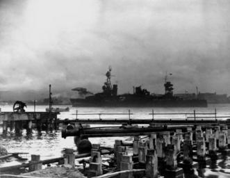 | Keywords: USS Northampton (CA-26) entering Pearl Harbor 8 Dec 1941.jpg The U S Navy heavy cruiser USS Northampton CA-26 steams into Pearl Harbor on the morning of 8 December 1941 the day after the Japanese air attack Photographed from Ford Island looking toward the Navy Yard with the dredging pipe in the foreground Northampton was at sea with Vice Admiral Halsey's task force on the day of the attack Note her Measure One dark camouflage with a Measure Five false bow wave and manned anti-aircraft director positions Official U S Navy photograph http //www history navy mil/our-collections/photography/wars-and-events/world-war-ii/pearl-harbor-raid/raid-aftermath/80-G-32548 html 80-G-32548 1941-12-08 USN PD-USGov-Military-Navy USS Northampton CA-26 Pearl Harbor attack - aftermath and salvage Camouflage Measure 1 Camouflage Measure 5 |