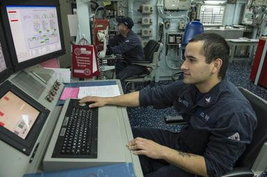 | Keywords: USS Ramage operations 131103-N-VC236-011.jpg en Gas Turbine System Technician Walter Garces front and Chief Gas Turbine System Technician Eric McCartney stand watch in Damage Control Central aboard the guided-missile destroyer USS Ramage Ramage home-ported in Norfolk Va is on a scheduled deployment supporting maritime security operations and theater security cooperation efforts in the U S 6th Fleet area of responsibility 2013-11-03 Electrical https //www dvidshub net/image/1049245 131103-N-VC236-011 2013-11-08 06 42 USS RAMAGE DDG 61 USAFRICOM AT SEA 3 PD-USGov-Military-Navy USS Ramage DDG-61 Images from DoD uploaded by Fæ |