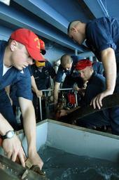 | Keywords: USS Ronald Reagan action DVIDS178798.jpg en Petty Officer 3rd Class SW Brett Malen damage controlman sprays water from a fire hose into a reservoir while memers of the damage control team work on connecting hoses to a P-100 water pump during rescue and assistance drills aboard the aircraft carrier USS Ronald Reagan RNA drills are held as a team building and training exercise where Sailors compete for the fastest time to get there pump connected and started Ronald Reagan is currently underway on a routine deployment to the Western Pacific 2009-06-11 Petty Officer 3rd Class Chelsea Kennedy https //www dvidshub net/image/178798 090611-N-+++++-221 2009-06-11 07 45 USS RONALD REAGAN AT SEA PD-USGov-Military-Navy USS Ronald Reagan CVN-76 Images from DoD uploaded by Fæ |