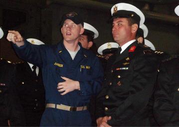| Keywords: USS San Antonio visits Alexandria, Egypt DVIDS154677.jpg en Ensign Matt Johnson electronic warfare officer aboard the amphibious transport dock ship USS San Antonio explains landing craft assault cushion operations to an Egyptian naval officer during a tour aboard the ship San Antonio is in Alexandria to commemorate the 100th anniversary of The Great White Fleet a historic U S goodwill voyage around the world 2009-02-24 Lt Charity Hardison https //www dvidshub net/image/154677 090224-N-+++++-008 2009-03-04 01 40 ALEXANDRIA EG PD-USGov-Military-Navy USS San Antonio LPD-17 Images from DoD uploaded by Fæ |