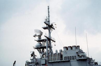 | Keywords: USS Scott (DDG-995) radars in 1994.JPEG A view of the fore mast of the U S Navy guided missile destroyer USS Scott DDG-995 showing the antennae array On top of the bridge is the SPG-51 missile radar illuminator; above that is the dome shaped SPQ-9A surface gun fire control radar; above that is the SPS-49 V 5 EW air search radar The small antenna near the top of the mast is the SPG-55 surface-search radar antenna To the aft end of the bridge is the SLQ-32 V 5 EW antennas http //www defenseimagery mil U S DefenseImagery photo VIRIN http //www defenseimagery mil/imagery html guid 3164e70b4eaae17d0889f963be9ee00bd22be6a0 DN-ST-95-00120 1994-07-02 Don S Montgomery USN Ret PD-USGov-Military-Navy USS Scott DDG-995 AN/SPS-49 AN/SPG-51 AN/SPQ-9 AN/SLQ-32 |