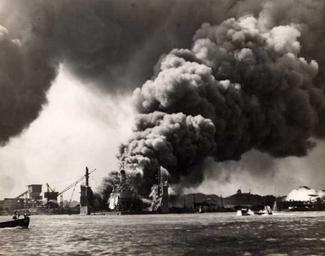| Keywords: USS Shaw burning in drydock prior to explosion 80G32719.jpg Pearl Harbor attack- Stern of USS Shaw DD-373 in floating drydock YFD-3 Shaw is has been attacked and fires are out of control which will later result in her forward magazine detonating Bow of USS Nevada is partly visible at far right of photo with tugboat Hoga tied up at the bow pouring water onto the Nevada fires source of image and caption text http //www de220 com/Pearl 20Harbor/Pearl 20Harbor htm NARA Photo 80-G-32719 User Makthorpe PD-USN USS Shaw DD-373 during the Pearl Harbor attack Yard Floating Dry Dock YFD-2 |
