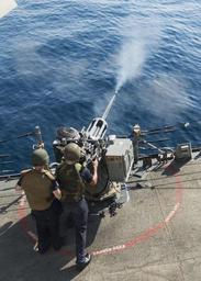 | Keywords: USS STOUT (DDG 55) LIVE-FIRE EXERCISE DEPLOYMENT 2016 160811-N-GP524-271.jpg en 160811-N-GP524-271 ARABIAN GULF Aug 11 2016 Fire Controlman 2nd Class Kurt Palmer fires a 25mm machine gun from aboard the guided-missile destroyer USS Stout DDG 55 during a live-fire exercise Stout deployed as part of the Eisenhower Carrier Strike Group is supporting maritime security operations and theater security cooperation efforts in the U S 5th Fleet area of operations U S Navy photo by Mass Communication Specialist 3rd Class Bill Dodge/Released Unit Navy Media Content Services DVIDS Tags SAR; Search and Rescue; formation; ocean; transit; Bahrain; RAS; USNS Pecos ; GQ; general quarters; Arleigh Burke-class; America; underway; CIWS; 6th Fleet; guided-missile destroyer; Manama ; forward deployed; Memorial Day; USS Stout DDG 55 ; ship; SUEZ CANAL; Navy; COMREL; Sailor; community relations; destroyer; replenishment-at-sea; U S Navy; 5th Fleet; deployment; MC; Stout; USS Stout; DDG 55; Lt Michael Murphy; NMCS; DVIDS Bulk Import; Mass Communication Specialist 3rd Class Bill Dodge; MC3 Bill Dodge; Murph Challenge; ARGONAUT 2016; Sailors giving back 2016-08-11 Petty Officer 3rd Class William Dodge https //www dvidshub net/image/2793882/uss-stout-ddg-55-live-fire-exercise-deployment-2016 160811-N-GP524-271 2016-08-16 00 00 AR PD-USGov-Military-Navy Manama USS Stout DDG-55 Images from DoD uploaded by Fæ |
