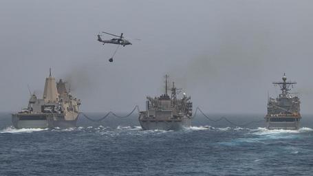| Keywords: USS STOUT (DDG 55) DEPLOYMENT 2016 160719-N-GP524-841.jpg en 160719-N-GP524-841 ARABIAN GULF July 19 2016 The fast combat support ship USNS Arctic T-AOE center refuels the amphibious transport dock USS New Orleans LPD 18 left and the amphibious dock landing ship USS Harpers Ferry LSD 49 Arctic New Orleans and Harpers Ferry are supporting maritime security operations and theater security cooperation efforts in the U S 5th Fleet area of operations U S Navy photo by Mass Communication Specialist 3rd Class Bill Dodge/Released Unit Navy Media Content Services DVIDS Tags SAR; Search and Rescue; formation; ocean; transit; Bahrain; RAS; USNS Pecos ; GQ; general quarters; Arleigh Burke-class; America; underway; CIWS; 6th Fleet; guided-missile destroyer; Manama ; forward deployed; Memorial Day; USS Stout DDG 55 ; ship; SUEZ CANAL; Navy; COMREL; Sailor; community relations; destroyer; replenishment-at-sea; U S Navy; 5th Fleet; deployment; MC; Stout; USS Stout; DDG 55; Lt Michael Murphy; NMCS; DVIDS Bulk Import; Mass Communication Specialist 3rd Class Bill Dodge; MC3 Bill Dodge; Murph Challenge; ARGONAUT 2016; Sailors giving back 2015-07-19 Petty Officer 3rd Class William Dodge https //www dvidshub net/image/2739990/uss-stout-ddg-55-deployment-2016 160719-N-GP524-841 2016-07-23 00 11 AR PD-USGov-Military-Navy Manama USS Harpers Ferry LSD-49 USS New Orleans LPD-18 USS Stout DDG-55 Images from DoD uploaded by Fæ |