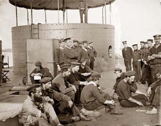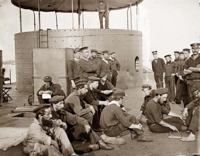 | Keywords: USSMonitor1862.1.ws.jpg Crewmen of the USS Monitor relaxing on deck while the ship was in the James River Virginia on 9 July 1862 View looks forward on the starboard side with the gun turret beyond Note men playing checkers at right Another man is reading a newspaper by the starboard smokestack <br/> Original caption now removed read Photo NH 574 Crewmen on deck of USS Monitor July 1862 U S Naval Historical Center Photograph Photo NH 574 USS Monitor 1862 http //www history navy mil/photos/sh-usn/usnsh-m/monitor htm<br/> Alternate version old-picture com http //www old-picture com/civil-war/Monitor-USS-Deck-of htm 1862 Gibson James F b 1828 PD-old PD-USGov-Military-Navy Metadata from image USS Monitor ship 1862 Chimneys 9 July July 1862 photographs People playing draughts 1862 in Virginia |