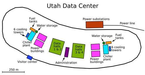 | Keywords: Utah Data Center of the NSA in Bluffdale Utah vector.svg Data Center In Utah built by National Security Agency of the United States Two pairs of Data Halls administrative buildings between them Each pair of data hall has two own power generation plants one chiller plant and 6 cooling towers Perimeter road is shown in black Data Center has own power substation With more then 1 million square feet it is http //www forbes com/pictures/fhgl45ijg/utah-data-center/ 3rd largest datacenter in the world Plans were published by Forbes com http //www forbes com/sites/kashmirhill/2013/07/24/blueprints-of-nsa-data-center-in-utah-suggest-its-storage-capacity-is-less-impressive-than-thought/ Blueprints Of NSA's Ridiculously Expensive Data Center In Utah Suggest It Holds Less Info Than Thought - 7/24/2013 Positions are drawn from OpenStreetMap map File OSM map of Utah Data Center of the NSA in Bluffdale Utah png CC-BY-SA 2 0 2013-12-29 07 19 17 own A5b thumb 40 42742 -111 93179 cc-zero Uploaded with UploadWizard Utah Data Center |