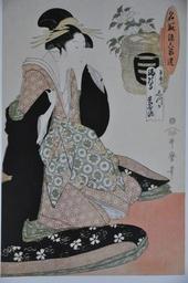 | Keywords: Utamaro La courtisane Shizuka et le sake Yômeishu.JPG en Ôban nishiki-e by Utamaro associating a famous sake brand written on the sake barrel at right and a famous courtesan One out of a series of six such prints all associating famous sake brands and glamorous courtesans Own Creator Kitagawa Utamaro 1794 Kitagawa Utamaro La courtisane Shizuka de la maison Tamaya ; le saké Yômeishu du Manganji 1794 Ôban nishiki-e Cette estampe fait partie d'une série de six estampes associant de grandes marques de saké à de célèbres courtisanes La marque du saké figure figure sur le baril de saké en haut à droite le long duquel se trouve une large coupe de saké à l'intérieur de laquelle figure le titre de la série Kitagawa Utamaro Sake barrels PD-old-100 |