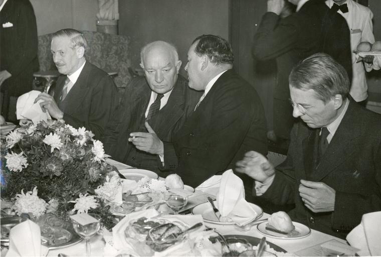 | Keywords: vårslipp 2012 vårslipp2012 trygve lie trygvelie andre verdenskrig andreverdenskrig 2. verdenskrig 2verdenskrig nordmenn i sverige under krigen nordmennisverigeunderkrigen people indoor Utenriksminister Trygve Lie ankom til Stockholm natt til 29. Oktober 1944 sammen med justisminister Terje Wold, medisinaldirektør Karl Evang og to sekretærer. Besøket skjedde etter innbydelse av Sveriges utenriksminister Günther. Bildet er hentet fra en lunsj som utenriksminister Lie arrangerte på Grand Hotel i Stockholm under sitt besøk. Fra høyre: utenriksminister Christian Günther, utenriksminister Trygve Lie, statsminister Per Albin Hansson, den britiske minister Sir Victor Mallet. Stockholm 15.11.44. Pa-1209, Serie Uc_66 Administrasjonen II Utenriksminister Trygve Lie ankom til Stockholm natt til 29. Oktober 1944 sammen med justisminister Terje Wold, medisinaldirektør Karl Evang og to sekretærer. Besøket skjedde etter innbydelse av Sveriges utenriksminister Günther. Bildet er hentet fra en lunsj som utenriksminister Lie arrangerte på Grand Hotel i Stockholm under sitt besøk. Fra høyre: utenriksminister Christian Günther, utenriksminister Trygve Lie, statsminister Per Albin Hansson, den britiske minister Sir Victor Mallet. Stockholm 15.11.44. Pa-1209, Serie Uc_66 Administrasjonen II |