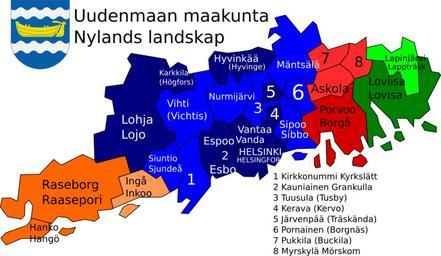 | Keywords: Uusimaa kunnat.svg fi Uudenmaan maakunnan seutukunnat kaupungit tummempi ja kunnat vaaleampi Oranssi on Raaseporin sininen Helsingin punainen Porvoon ja vihrea Loviisan seutukunta sv Nylands landskap med ekonomisk regioner stader mörkare och kommuner ljusare Orange är Raseborgs blå Helsingfors röd Borgås och grön Lovisas ekonomisk region en Uusimaa region with sub-regions cities darker and municipalities lighter Orange is Raseborg's blue Helsinki's red Porvoo's and green Loviisa's sub-region own Canukki 2011-01-22 Maps of Uusimaa Municipalities in Uusimaa |
