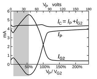 | Keywords: UY224 tetrode plate current negative resistance.svg plate anode and screen grid current vs plate voltage in a UY224 1920s era tetrode vacuum tube showing region of negative resistance grey used in dynatron oscillator circuit I<sub>P</sub> Plate anode current I<sub>G2</sub> Screen grid current I<sub>C</sub> Cathode current is equal to the sum of I<sub>P</sub> and I<sub>G2</sub> Control grid potential V<sub>G1</sub> ˆ’1 5 V Screen grid potential V<sub>G2</sub> 75 V When electrons from the cathode hit the plate they knock secondary electrons out of the metal a process called secondary emission If the screen grid is made positive with respect to the plate the secondary electrons will be attracted to it representing a current away from the plate For a certain plate voltage range grey an increase in plate voltage will cause a greater increase in secondary electrons than primary electrons so the plate current will decrease Thus the differential plate resistance is negative r<sub>P</sub> ΔV<sub>P</sub> / ΔI<sub>P</sub> < 0 This negatve resistance was used in the dynatron oscillator circuit to cancel the resistance in a tuned circuit creating oscillations The dynatron oscillator was used in some instruments in the 1930s and 40s In modern tetrodes the surface of the plate is treated to greatly reduce secondary emission so they don't have negative resistance Note Due to the fact that the screen grid screens out the electric field of the plate the cathode current I<sub>C</sub> is almost constant with plate voltage So the plate and screen currents are almost mirror images of each other Within the range V<sub>P</sub> 20 - 60 V each electron striking the plate actually knocks out more than one secondary electron so the plate current actually reverses - more electrons leave the plate than enter it 1952 Tracing of a graph retrieved 18 October 2013 from http //www tubebooks org/Books/intro_army_theory pdf Basic Theory and Application of Electron Tubes US Dept of the Army Technical Manual TM 11-662 February 1952 US Dept of Defense p 90 fig 71 on Pete Miller's http //www tubebooks org/index html tubebooks org website Original work K E Thiebaud Derived work Chetvorno PD-USGov Uploaded with UploadWizard Vacuum tube diagrams Device current-voltage characteristics |