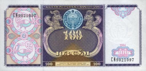 | Keywords: UZS100 1994 front.jpg 100 сум Узбекистана 1994 100 sum of Uzbekistan 1994 own scan 1994 Central Bank of the Republic of Uzbekistan Цент альный банк Республики Узбекистан Ўзбекистон Республикаси а казий банки PD-UZ-exempt banknotes Banknotes of Uzbekistan Banknotes with a face value of 100 1994 banknotes Peacocks on banknotes Coats of arms of Uzbekistan on banknotes |