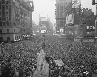 | Keywords: V-J Day in New York City. Crowds gather in Times Square to celebrate the surrender of Japan. - NARA - 531350.tif Scope and content General notes Use War and Conflict Number 1359 when ordering a reproduction or requesting information about this image 531350 Local identifier 111-SC-329414 Department of Defense Department of the Army Office of the Chief Signal Officer 09/18/1947 - 02/28/1964 Still Picture Records Section Special Media Archives Services Division NWCS-S National Archives at College Park 8601 Adelphi Road College Park MD 20740-6001 Taken on 1945-08-15 Record group Record Group 111 Records of the Office of the Chief Signal Officer 1860 - 1985 Record group ARC 440 Signal Corps Photographs of American Military Activity compiled 1754 - 1954 Series ARC 530707 File unit File unit ARC Variant control numbers NAIL Control Number NWDNS-111-SC-329414 yes Other versions NARA-cooperation PD-USGov Surrender of Japan 15 August 1945 V-J Day in Times Square Crowds in Times Square Historic images of crowds |