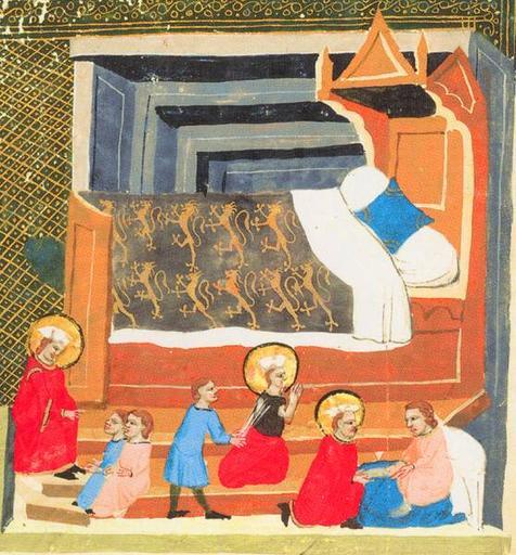 | Keywords: Vaclav postel.jpg Václav vzdělává své služebníky ve víře a kajícně se nechá od nich mrskat metlou a myje jim nohy http //ff ujep cz/velimsky/cs_1_1/03CS/dalimil10_postel jpg Dalimilova kronika century 14 Author Chronik Dalimil Miniatures of Saint Wenceslaus Beds in medieval miniatures PD-Art |