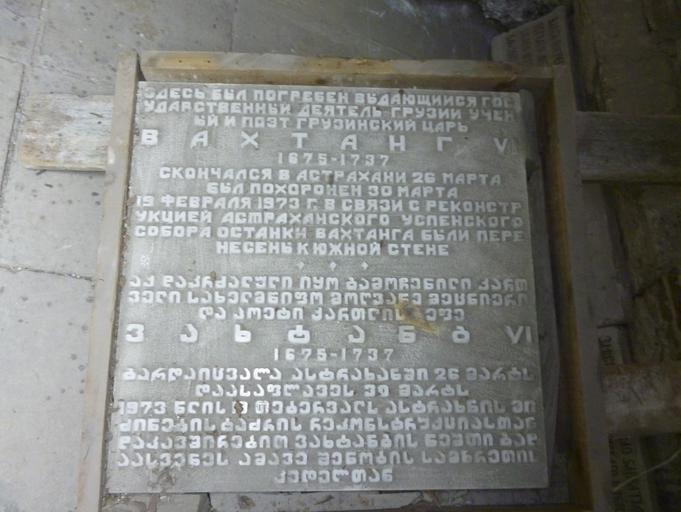 | Keywords: Vakhtang VI commemorative plaque in Astrakhan.jpg ru емо иальная доска посвящённая ца ю Ка тли Вахтангу VI Установлена в Успенском собо е Аст ахани в советское в емя демонти ована в 1990-х годах в ходе еконст укции собо а 2013-12-21 21 37 30 own Andreykor cc-zero Uploaded with UploadWizard Cathedral of the Dormition Astrakhan Vakhtang VI Mkhedruli plaques | ||||