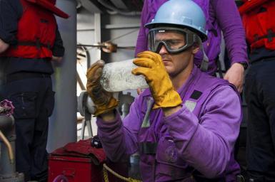 | Keywords: Valiant Shield 2014 140920-N-ZK360-315.jpg en Aviation Boatswain's Mate Airman Travis Roach takes a fuel sample for a flash point water and sediment test during a replenishment-at-sea between the U S Navy's forward-deployed aircraft carrier USS George Washington and Military Sealift Command fleet replenishment oiler USNS John Ericsson During the RAS ships from Commander Task Force 70 and 73 participated in a simulated submarine threat exercise for Valiant Shield 2014 Valiant Shield is a U S -only exercise integrating an estimated 18 000 Navy Air Force Army and Marine Corps personnel more than 200 aircraft and 19 surface ships offering real-world joint operational experience to develop capabilities that provide a full range of options to defend U S interests and those of its allies and partners 2014-09-20 Fueling https //www dvidshub net/image/1558743 140920-N-ZK360-315 2014-09-21 06 21 USS GEORGE WASHINGTON CVN 73 AT SEA PD-USGov-Military-Navy USS George Washington CVN-73 Images from DoD uploaded by Fæ |