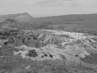 Keywords: valley of love tufa plateau plateau viewpoint human hiking tourists outlook tufa cappadocia turkey black and white
