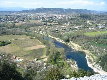 Keywords: Vallon-Pont-D-Arc03.jpg Vallon-Pont-D'Arc and the Ardèche river France View from La Costette on the right bank of the Ardèche river on the commune of Sampzon own 09 04 07 Markus Braun Vallon-Pont-d'Arc Ardèche River