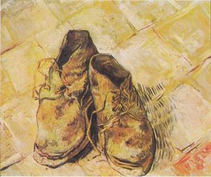 | Keywords: Van Gogh - Ein Paar Schuhe4.jpeg Ein Paar Schuhe A pair of shoes oil canvas 44 x 53 cm New York S Kramarsky Trust Fund Van Gogh catalogues 461 1569 repro from art book Arles August 1888 Creator Vincent van Gogh PD-old-100 Other versions Still life paintings of shoes by Vincent van Gogh Arles 1888 |