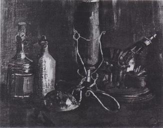 | Keywords: Van Gogh - Stillleben mit Flaschen, Vase und Muschel.jpeg Stillleben mit Flaschen Vase und Muschel Still life with bottles vase and shell Öl auf Leinwand auf Holz Oil on canvas on wood 30 5 x 40 cm Verbleib unbekannt Van Gogh catalogues 64 537 repro from art book Nuenen November 1884 Creator Vincent van Gogh PD-old-100 Other versions Van Gogh 1884-1885 | ||||