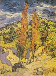| Keywords: Van Gogh - Zwei Pappeln an einem Weg durch die Hügel.jpeg Artwork Creator Vincent van Gogh Van Gogh painted this autumnal landscape while at an asylum near Saint-Rémy in southern France Although at first limited to painting from memory in his room he soon resumed working outdoors This painting reveals the full power of his mature style Trees twist and lean against a darkening sky while the intense colors applied with charged brushstrokes convey his emotional reaction to the subject <ref>http //www clevelandart org/art/1958 32 Cleveland Museum of Art</ref> reflist Saint-Rémy 1889 10 oil canvas cm 61 6 45 7 Cleveland Museum of Art Not on view http //www clevelandart org/art/1958 32 The Cleveland Museum of Art<br/>http //www vangoghgallery com/catalog/Painting/646/Two 20Poplars 20on 20a 20Road 20Through 20the 20Hills html vangoghgallery com object history credit line Bequest of Leonard C Hanna Jr 1958 Van Gogh catalogues 638 1797 accession number 1958 32 repro from artbook 200px PD-old-100 DEFAULTSORT Van Gogh 1889-10 Poplars at Saint-Rémy Cleveland Museum of Art Two Poplars on a Road Through the Hills |