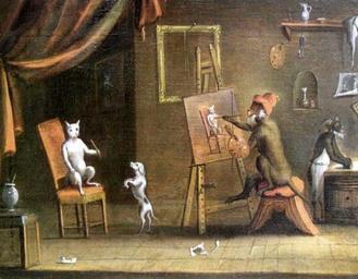 | Keywords: Van Kessel, Ferdinand the Younger (follower) - Le singe peintre - 17th c.jpg Follower of Le singe peintre century 17 oil canvas 32 x 41 cm Gallery Location http //www artnet com/Artists/LotDetailPage aspx lot_id 53131DD51770952D0E90692EAB5A8AD0 www artnet com<sup> complete data is available for subscribers </sup><br>The year of production is unclear but it is probably contemporary http //images artnet com/WebServices/picture aspx date 20050427 catalog 74333 gallery 111300 lot 00133 filetype 2 Other versions PD-old-100 Ferdinand van Kessel Singe peintre 17th-century genre paintings Oil paintings of animals Paintings of cats Primates as painters in art 17th-century paintings of dogs Painting in art 17th-century paintings not categorised by year 17th-century oil on canvas paintings 17th-century paintings location missing Niches in art Curtains in art Animals with human clothing Sitting cats Images from Artnet com Uploads by Mattes from external sources |