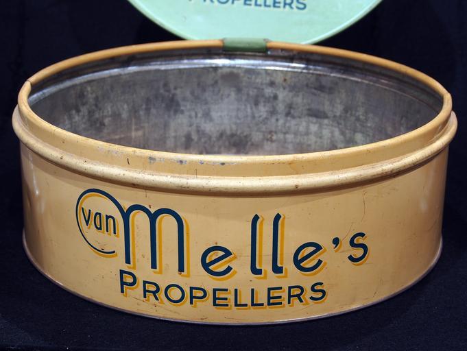 | Keywords: Van Melles Propellers blik, foto 1.JPG Very old packaging of a Dutch product that is not produced and/or not sold any more Photographed at a collector of Droste memorabilia and old tin cans For more info see http //www tincollectors nl/ tincollectors nl or email info tincollectors nl own 2014-04-11 13 58 51 Alf van Beem CC-Zero Trademarked Sweets tins Van Melle PH-IPM aircraft | ||||