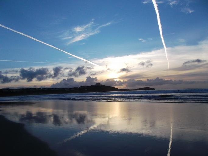 Keywords: vapour trail sky blue reflection sea beach evening sunset landscape dusk shore seascape coastline air travel