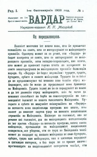 | Keywords: Vardar1.jpg  en The cover page of the Macedonian magazine Vardar published by Krste Petkov Misirkov in Odesa on 1 September 1905 mk Ко ица на македонското списание Ва да издадено од ст ана на К сте Петков  иси ков во Одеса на 1 септемв и 1905 Originaly uploaded on mk wikipedia org K P Misirkov 1905-01-01 Magazine Vardar PD-old  |