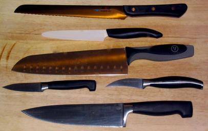 | Keywords: Various cooking knives - Kyocera, Henckels, Mac, Wiltshire.JPG en Various kitchen knives laid out on a wooden cutting board From top to bottom 8 inch serrated Mac bread knife 4 inch Kyocera ceramic utility with microserrated blade 8-inch Dexter-Russel santoku knife 2-inch Henckels vegetable knife left 2 inch Henckels Twin Cuisine curved-blade peeling knife right 8-inch Henckels chefs knife fr Couteaux de cuisine professionnels disposés sur une planche à découper couteau à pain couteau à lame en céramique couteau japonais santoku à tranchant alvéolé couteau à légumes et couteau courbe pour peler les fruits et légumes couteau de chef own 2007-10-02 WLU Kitchen knives Ceramic knives Santoku knives Wooden cutting boards Bread knives Paring knives |