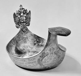 | Keywords: Vasilli Matveev Kunkin - Drinking Bowl (Kovsh) - Walters 57799.jpg Kovshi are boat-shaped bowls or ladles originally made of wood which can be traced back to the 14th century This piece carries the double-headed eagle state emblem of the Russian Empire By the 18th century large drinking bowls like this one were were no longer used as actual tableware but were rather awarded as gifts by the sovereign and proudly displayed at home by their recepients The inscription notes that Empress Elizabeth I 1709-1762 presented this sumptuous example to the merchant Konan Saveschkov who had been a contractor for the army since 1752 1758 Early Modern parcel gilt on silver H cm 15 3 accession number 57 799 31094 Alexandre Polovtsoff Aleksandr Aleksandrovich Polovtsov St Petersburg and Paris by purchase Henry Walters city Baltimore Walters Art Museum Henry Walters Acquired by Henry Walters 1928 Translation in the cartouches We Elizabeth the First by the grace of God empress and sovereign of all Russia etcetera etcetera etcetera awarded with this kovsh the Moscow merchant of the first guild Konon son of Basil Sabelshchikov for the discounts he has been making for six years since 1752 to the advantage of our most high interest at the Main Commissariat auctions for the supplying of our army and so that he may also in the future show zeal in providing such supplies for the army to the advantage of our interest A Millennium of Christianity Russian Art from The Walters Art Gallery The Walters Art Gallery Baltimore 1988-1989 place of origin Moscow Russia Walters Art Museum license Vasilli Matveev Kunkin Collections of the Walters Art Museum Silver bowls Bowls drinking vessels 1758 works in Russia Double-headed eagles Russia in the 18th century Silver-gilt Ladles Double-headed eagle of Russia Kovshs Elizabeth of Russia 1758 in art |