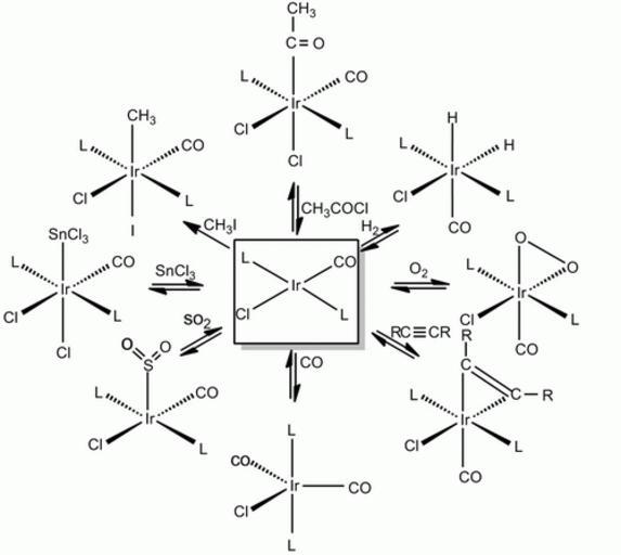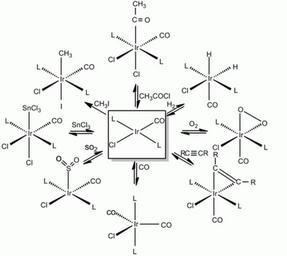 Keywords: Vaska's complex3.png en Various Oxidative Addition reactions of Vaska's complex own Chem507f10grp2 Vaska's complex