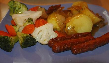 Keywords: vegetables sausage bratwurst food delicious eat lunch court cook tasty nutrition potato buttered vegetables carrots carrot vegetable main course grill sausage