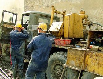 Keywords: vehicle cargo industry transportation truck transport industrial trailer machine trucking green old dirty filthy muddy mud retro heavy worker people workers male helmet