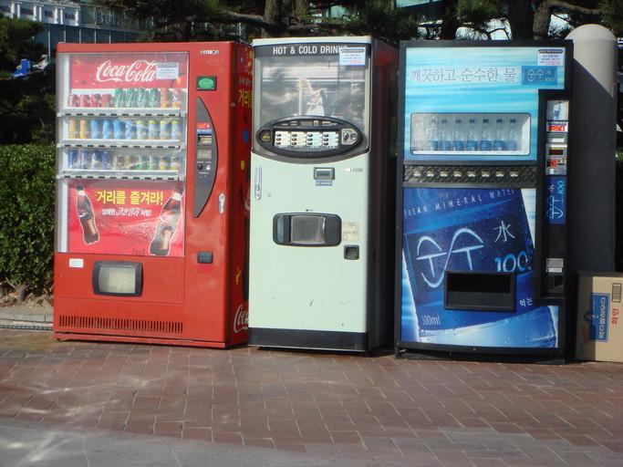 Keywords: Vending machines at Haeundae.jpg Set of three vending machines at Haeundae Left Soft drinks Center Coffee Right Water 2007-11-16 own assumed Yuyudevil Coca-Cola vending machines Haeundae Coffee vending machines Water vending machines