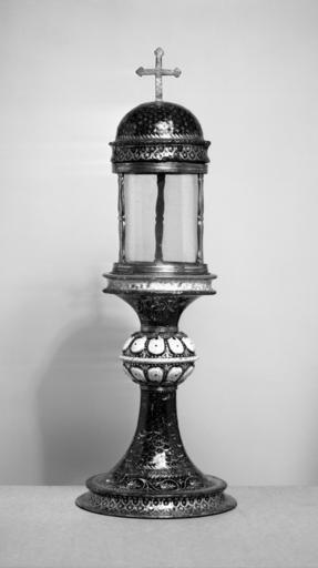 Keywords: Venetian - Reliquary with Floral Scrolls - Walters 44171 - Profile.jpg The inside of the foot is coated with blue enamel on white and sprinkled with gilt stars It shows a pointed shield or charged with three crescents azure This coat-of-arms may refer to any one of three Venicen families Barberi Barbetta or Barba ca 1500 technique painted enamel gold copper H 14 15/16 x Diam of base 5 5/16 in 38 x 13 49 cm accession number 44 171 24118 Raoul Heilbronner Paris date of acquisition unknown by purchase Henry Walters Baltimore 1911 by purchase Walters Art Museum Henry Walters Acquired by Henry Walters 1911 place of origin Venice Italy Walters Art Museum license Renaissance applied arts in the Walters Art Museum Art of Venice Media contributed by the Walters Art Museum needs category review Painted enamel art in the Walters Art Museum |