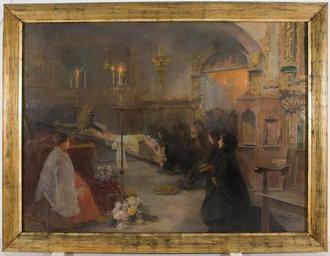 | Keywords: Venite Adoremus 261.jpg Artwork Creator Arcadi Mas ca Interior d'una església iluminada amb espelmes i ornamentada amb decoració barroca Grup de dones i un home agenollats i vestits de negre adorant un Sant Crist inclinat Al costat de la imatge hi ha canelobres de ferro forjat rams de flors i un escolà assegut i amb sotana vermella between Oil on canvas cm Institution Biblioteca Museu Víctor Balaguer object history exhibition history credit line accession number place of creation Biblioteca Museu Víctor Balaguer-cooperation PD-Art PD-old-100-1923 Uploaded with UploadWizard Paintings in the Biblioteca Museu Víctor Balaguer Religion and art Dipòsit del MNAC a la BMVB |