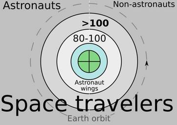 | Keywords: Venn diagram space travelers orbit shades7minusd.svg astronaut wings in the 1960s The encircling region labeled >100 kilometres and all further regions represent space as defined by the Fédération Aéronautique Internationale FAI The dashed circle with arrow represents Earth orbit Space travelers may be either astronauts or non-astronauts Not all astronauts are space travelers Note that mediawiki may produce an incorrectly rendered image in the preview image above where the text is truncated The source SVG is nevertheless correct and renders correctly in these software programs Firefox 3 6 3 Opera 10 51 build 3315 Windows NT 6 0 Google Chrome 4 1 249 1045 42898 Safari 3 2 1 525 27 1 2010-04-03 Own 84user en The font-family specified is DejaVu Sans and no Flowed Text box elements were used The circle4 object had an element d which the W3C validator reported as an invalid attribute so it was manually in order to obtain valid SVG 84user thumb left PNG version that renders correctly thumb right Version with two font sizes reduced to workaround mediawiki fonts problem ValidSVG Created with Inkscape 1 120px thumb Rendered at 120 pixels 150px thumb Rendered at 150 pixels 180px thumb Rendered at 180 pixels 200px thumb Rendered at 200 pixels 220px thumb Rendered at 220 pixels 250px thumb Rendered at 250 pixels 300px thumb Rendered at 300 pixels Space exploration Astronauts |