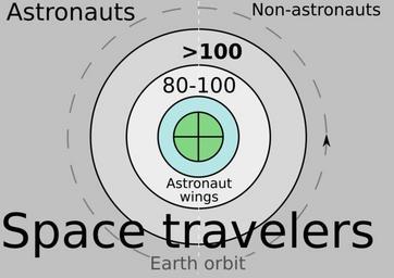 | Keywords: Venn diagram space travelers orbit shades7kludgeminusd.svg astronaut wings in the 1960s The encircling region labeled >100 kilometres and all further regions represent space as defined by the Fédération Aéronautique Internationale FAI The dashed circle with arrow represents Earth orbit Space travelers may be either astronauts or non-astronauts Not all astronauts are space travelers Note that mediawiki may produce an incorrectly rendered image in the preview image above where the text is truncated The source SVG is nevertheless correct and renders correctly in these software programs Firefox 3 6 3 Opera 10 51 build 3315 Windows NT 6 0 Google Chrome 4 1 249 1045 42898 Safari 3 2 1 525 27 1 2010-04-03 Own 84user en The font-family specified is DejaVu Sans and no Flowed Text box elements were used Additionally two font sizes were further reduced in an attempt to workaround the mediawiki fonts problem The circle4 object had an element d which the W3C validator reported as an invalid attribute so it was manually in order to obtain valid SVG 84user thumb right Version with normal font sizes which mediawiki may render strangely ValidSVG Created with Inkscape 1 120px thumb Rendered at 120 pixels 150px thumb Rendered at 150 pixels 180px thumb Rendered at 180 pixels 200px thumb Rendered at 200 pixels 220px thumb Rendered at 220 pixels 250px thumb Rendered at 250 pixels 300px thumb Rendered at 300 pixels Space exploration Astronauts |