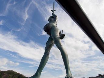 Keywords: verity stainless steel stainlesssteel bronze statue bronzestatue damien hirst damienhirst sculpture pier harbour ilfracombe devon bristol channel truth modern allegory truth and justice truthandjustice pregnant woman pregnant woman pregnantwoman fetus scales of justice scalesofjustice little dancer littledancer edgar degas edgardegas virgin mother virginmother pangolin polymer-strengthened fibre glass polymerstrengthenedfibreglass fibre glass fibreglass angel of the north angelofthenorth controversial critical ugly outdoor Verity is a stainless steel and bronze statue created by Damien Hirst. The 20.25-metre (66.4 ft) tall sculpture stands on the pier at the entrance to the harbour in Ilfracombe, Devon, looking out over the Bristol Channel towards South Wales. It has been loaned to the town for 20 years. The name of the piece refers to "truth" and Hirst describes his work as a "modern allegory of truth and justice". The statue depicts a pregnant woman holding aloft a sword while carrying the scales of justice and standing on a pile of law books. Half of the sculpture shows the internal anatomy of the pregnant woman, with the fetus clearly visible. The stance has been described as a reference to Little Dancer of Fourteen Years by Edgar Degas, a work that previously inspired Hirst when he created Virgin Mother. The sculpture was cast in stainless steel and bronze in 40 separate sections by Pangolin Editions. The sword, which gives the statue much of its height, and the upper left arm is one polymer-strengthened fibre glass piece. Before being cleared for erection the statue was subjected to tests in a wind tunnel to ensure that it could cope with high winds and spray from the sea. Measuring 25cm (10 inches) higher than the Angel of the North, Verity became the tallest statue in the UK when it was put into place. Members of North Devon Council referred to the controversial nature of the statue as a potential boost to tourism. Local reaction was very mixed, with those critical of the work calling it "ugly" and stating that "it isn't suitable for a Victorian seaside town". Before they allowed planning permission the council received 100 letters from people who objected to the installation of the statue, and 177 letters supporting the application. In August 2013 councillors announced that the statue had a "tremendous effect" with people visiting the town solely to see Hirst's work. Hirst, who lives in Ilfracombe, has loaned the statue to the town for 20 years starting from its erection on 16 October 2012. Verity is a stainless steel and bronze statue created by Damien Hirst. The 20.25-metre (66.4 ft) tall sculpture stands on the pier at the entrance to the harbour in Ilfracombe, Devon, looking out over the Bristol Channel towards South Wales. It has been loaned to the town for 20 years. The name of the piece refers to "truth" and Hirst describes his work as a "modern allegory of truth and justice". The statue depicts a pregnant woman holding aloft a sword while carrying the scales of justice and standing on a pile of law books. Half of the sculpture shows the internal anatomy of the pregnant woman, with the fetus clearly visible. The stance has been described as a reference to Little Dancer of Fourteen Years by Edgar Degas, a work that previously inspired Hirst when he created Virgin Mother. The sculpture was cast in stainless steel and bronze in 40 separate sections by Pangolin Editions. The sword, which gives the statue much of its height, and the upper left arm is one polymer-strengthened fibre glass piece. Before being cleared for erection the statue was subjected to tests in a wind tunnel to ensure that it could cope with high winds and spray from the sea. Measuring 25cm (10 inches) higher than the Angel of the North, Verity became the tallest statue in the UK when it was put into place. Members of North Devon Council referred to the controversial nature of the statue as a potential boost to tourism. Local reaction was very mixed, with those critical of the work calling it "ugly" and stating that "it isn't suitable for a Victorian seaside town". Before they allowed planning permission the council received 100 letters from people who objected to the installation of the statue, and 177 letters supporting the application. In August 2013 councillors announced that the statue had a "tremendous effect" with people visiting the town solely to see Hirst's work. Hirst, who lives in Ilfracombe, has loaned the statue to the town for 20 years starting from its erection on 16 October 2012.