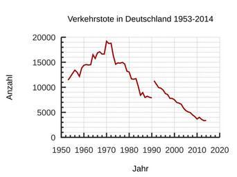 | Keywords: Verkehrstote Deutschland.svg en Traffic deaths in Germany 1953-2014 de Verkehrstote in Deutschland 1953-2014 Verkehrstote Deutschland 1953-2013 svg 50 Verkehrstote_deutschland_1953-2008 svg Benny R derivative work Kopiersperre this derivative work Horas 2015-03-26 Datengrundlage v reset set terminal svg size 400 300 enhanced font 14 set output Verkehrstote_Deutschland svg set grid xtics ytics mytics lw 0 5 lc rgb 555555 dashtype 3 lt 1 set border 3 back lw 2 lc rgb 222222 set tics in nomirror scale 0 75 set title Verkehrstote in Deutschland 1953-2014 set xtics 10 set mxtics 5 set xlabel Jahr set yrange 0 20000 set xrange 1950 2020 set ytics 5000 set mytics 5 set ylabel Anzahl unset key set ls 1 lw 2 lc rgb a00000 plot unfaelle dat u 1 6 with l ls 1 unset output <pre> unfaelle dat Quelle Statistisches Bundesamt https //www destatis de/DE/ZahlenFakten/Wirtschaftsbereiche/TransportVerkehr/Verkehrsunfaelle/Tabellen_/Strassenverkehrsunfaelle html bis 2011 https //www destatis de/DE/ZahlenFakten/Wirtschaftsbereiche/TransportVerkehr/Verkehrsunfaelle/Tabellen/UnfaelleVerunglueckte html 2009-2014 Abrufdatum Mai 2014 Jahr Polizeilich erfasste Unfälle insgesamt davon mit Personenschaden Sachschaden Verunglückte insgesamt davon Getötete Verletzte 2014 vorläufig 2014 2397080 302039 2095041 392388 3368 389020 2013 2377693 291105 2086722 377481 3339 374142 2012 2414011 299637 2087299 387978 3600 384312 2011 2361457 306266 2055191 396374 4009 392365 2010 2411271 288297 2122974 374791 3651 371140 2009 2313453 310806 2002647 401823 4152 397671 2008 2293663 320614 1973049 413524 4477 409047 2007 2335005 335845 1999160 436368 4949 431419 2006 2235318 327984 1907334 427428 5091 422337 2005 2253992 336619 1917373 438804 5361 433443 2004 2261689 339310 1922379 445968 5842 440126 2003 2259567 354534 1905033 468783 6613 462170 2002 2289474 362054 1927420 483255 6842 476413 2001 2373556 375345 1998211 501752 6977 494775 2000 2350227 382949 1967278 511577 7503 504074 1999 2413473 395689 2017784 528899 7772 521127 1998 2257649 377257 1880392 505111 7792 497319 1997 2232379 380835 1851544 509643 8549 501094 1996 2269570 373082 1896488 501916 8758 493158 1995 2238301 388003 1850298 521595 9454 512141 1994 2270818 392754 1878064 526229 9814 516415 1993 2345396 385384 1960012 515540 9949 505591 1992 2384579 395462 1989117 527428 10631 516797 1991 2311466 385147 1926319 516835 11300 505535 1990 2010575 340043 1670532 456064 7906 448158 1989 1997787 343604 1654183 457392 7995 449397 1988 2022648 342299 1680349 456436 8213 448223 1987 1977501 325519 1651982 432589 7967 424622 1986 1935595 341921 1593674 452165 8948 443217 1985 1840295 327745 1512550 430495 8400 422095 1984 1780818 359485 1421333 476232 10199 466033 1983 1692934 374107 1318827 500942 11732 489210 1982 1629089 358693 1270396 478796 11608 467188 1981 1678497 362617 1315880 487618 11674 475944 1980 1684604 379235 1305369 513504 13041 500463 1979 1660680 367500 1293180 499663 13222 486441 1978 1619187 380352 1238835 523306 14662 508644 1977 1523392 379046 1144346 523120 14978 508142 1976 1418523 359694 1058829 495401 14820 480581 1975 1264567 337732 926835 472667 14870 457797 1974 1228997 331000 897997 461756 14614 447142 1973 1324738 353725 971013 504548 16302 488246 1972 1381526 378775 1002751 547338 18811 528527 1971 1338059 369177 968882 536812 18753 518059 1970 1392007 377610 1014397 550988 19193 531795 1969 1213587 338921 874666 489033 16646 472387 1968 1181156 339704 841452 485354 16636 468718 1967 1144210 335552 808658 479132 17084 462048 1966 1167823 332622 835201 473700 16868 456832 1965 1099346 316361 782985 449243 15753 433490 1964 1089086 328668 760418 462666 16494 446172 1963 1096539 314642 781897 438811 14513 424298 1962 1079101 321257 757844 442933 14445 428488 1961 1029381 339547 689834 462470 14543 447927 1960 990127 349315 640812 469366 14406 454960 1959 843412 327595 515817 433649 13822 419827 1958 751784 296697 455087 384693 12169 372524 1957 678889 299866 379023 389145 13004 376141 1956 663741 307012 356729 396572 13427 383145 1955 603351 296071 307280 383951 12791 371160 1954 523765 267925 255840 347032 12071 334961 1953 473027 251618 221409 326606 11449 315157 </pre> Statistics of Germany Damage by road transport Road transport statistics |