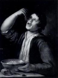 | Keywords: Vermeer van Utrecht Man eating noodels.JPG Artwork Creator Jan Vermeer van Utrecht 1656 oil canvas cm 93 5 72 Institution National Museum Warsaw accession number object history credit line One of Vermeer's ironies painted in a Caravaggesque style p 38 Jonathan Bikker 2005 Willem Drost 1633-1659 A Rembrandt Pupil In Amsterdam And Venice Yale University Press ISBN 03-00105-81-9 See below PD-old-100 DEFAULTSORT 1656; Man eating noodels Jan Vermeer van Utrecht Paintings by Jan Vermeer van Utrecht in the National Museum in Warsaw 1656 paintings 17th-century oil paintings of men at half length Black and white reproductions of paintings in color Men facing left in art Noodles in art People eating noodles |