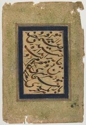 | Keywords: Verses from Niẓāmī's "Divan" WDL6840.png Artwork ru изами Гянджеви 1140 г или 1141 г - 1202 г или 1203 г fr Niẓāmī Ganjavī 1140 ou 1141-1202 ou 1203 en Niẓāmī Ganjavī 1140 or 41-1202 or 3 zh 尼扎米·甘伽维 1140或1141年- 1202或1203年 pt Niẓāmī Ganjavī 1140 ou 1141-1202 ou 1203 ar نظامي الكنجوي 1140 أو 1141-1202 أو 1203 es Niẓāmī Ganjavī 1140/1141 a 1202/1203 ru Стихи из Дивана изами fr Versets du « Divan » de Nizami en Verses from Niẓāmī's Divan zh 摘自尼扎米 诗歌合集 的诗句 pt Versos do Divan de Niẓāmī ar أبيات من ديوان النظامي ru В данный каллиг афический ф агмент входит несколько стихов из <em> Дивана </em> сбо ника стихотво ений изами 1140 или 1141 1202 или 1203 гг После начальной молитвы Богу в стихах описывается как те или иные люди и п едметы иг ают оп еделенные оли в нашем ми е Для каждого идола кото ого они создали / Они сшили одеяние ему по азме у / е каждому суждено быть напе сником власти / е каждый осел может нести Иисуса Стихи написаны темно-ко ичневыми че нилами на бежевой бумаге и об амлены синей каймой Текст вклеен в больший по азме у лист бежевой бумаги с зелеными к апинками к аски и ка тонной подложкой Он подписан неким Абу аль- аали чье имя написано по диагонали в цент е композиции Однофамилец известного каллиг афа Абу аль- аали Изз аль-Дина Абд аль-Ваххаба Занжани уме в 1209 году / в 606 году хидж ы ученика Якута аль- устасими Абу аль- аали кото ый написал этот текст ш ифтом насталик должно быть аботал намного позднее Это п оизведение напоминающее яд каллиг афических абот Сефевидов по своей фо ме и стилю написания ве оятно было создано в XVI или XVII веках <br>Каллиг афия пе сидская; Иллюмини ование укописей; Исламская каллиг афия; Исламские укописи; Пе сидская поэзия; Поэзия fr Ce fragment de calligraphie comprend plusieurs versets du <em>Divan</em> Recueil de poèmes de Nizami 1140 ou 1141 1202 ou 1203 Après une invocation de Dieu initiale les versets décrivent comment certaines choses et personnes remplissent un rôle particulier dans le monde « Pour chaque idole qu'ils ont fabriquée / Ils ont cousu une robe de la taille de son corps / Tout le monde ne peut pas être le confident du pouvoir / Tous les ânes ne peuvent pas porter Jésus » Les versets sont exécutés à l'encre marron foncé sur un papier beige encadré d'une bordure bleue Le texte est collé sur une feuille de papier beige plus grande décorée de mouchetures de peinture verte et renforcée par un carton Il est signé d'un certain Abu al-Maali dont le nom apparait dans une diagonale opposée au centre de la composition Bien qu'homonyme du calligraphe réputé Abu al-Ma'ali 'Izz al-Din 'Abd al-Wahhab Zanjani mort en 606 après l'Hégire/1209 après J -C disciple de Yaqut al-Mustasimi le Abu al-Maali qui a composé ce fragment en écriture nastaliq a dû être actif à une date bien ultérieure La composition qui rappelle un certain nombre d'exercices de calligraphie séfévides dans sa teneur formelle et son style de calligraphie a certainement été exécutée durant le XVI<sup>e</sup> ou le XVII<sup>e</sup> siècle <br>Calligraphie persane; Enluminures; Calligraphie islamique; Manuscrits islamiques; Poésie persane; Poésie en This calligraphic fragment includes several verses from the <em>Divan</em> Compendium of poems by Niẓāmī' 1140 or 1141 1202 or 1203 After a beginning invocation to God the verses describe how certain things and people fulfill particular roles in the world For every idol that they fashioned / They sewed a robe the size of its body / Not everyone can be the confidant of power / Not every donkey can carry Jesus The verses are executed in dark-brown ink on a beige paper framed by a blue border The text is pasted to a larger sheet of beige paper decorated with green flecks of paint and backed by cardboard It is signed by a certain Abu al-Ma'ali whose name appears in an opposite diagonal at the center of the composition Although sharing his name with the reputed calligrapher Abu al-Ma'ali 'Izz al-Din 'Abd al-Wahhab Zanjani died 606 AH/1209 a disciple of Yaqut al-Musta'simi the Abu al-Ma'ali who composed this fragment in Nasta'liq script must have been active at a much later date The composition which recalls a number of Safavid calligraphic exercises in its formal makeup and calligraphic style must have been executed during the 16th or 17th century <br>Calligraphy Persian; Illuminations; Islamic calligraphy; Islamic manuscripts; Persian poetry; Poetry zh 此书法残卷中包含几句摘自尼扎米(Niẓāmī',1140 或 1141 1202 或 1203 年)<em>Divan</em>( 诗歌合集 )的诗歌 诗歌 头是向 主的祈祷,之后描述了世界上的若干事情和人们是如何发挥特定 用的: (对于)他们塑 的每个偶像/他们按照偶像的身 制长袍/不是每个人都可以是偶像的知己/不是每头驴都可以载尔萨 这些诗句是以深棕色墨水写 张米色纸张上,用 色边框裱起 字幅被粘贴到 张饰 