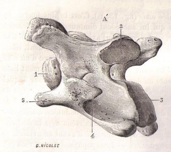 Keywords: VertebreCervicaleChevalChauveau1890.jpg en Lateral view of the 6th cervical vertebra of a horse Equus caballus fr Vue latérale d'une 6ème vertèbre cervicale Vertebra cervicale de cheval Equus caballus <br /> 1 tête de la vertèbre tête articulaire <br /> 2 processus articulaire caudal apophyse articulaire postérieure <br /> 3 fosse de la vertèbre cavité articulaire <br /> 4 processus transverse prolongement postérieur de l'apophyse transverse <br /> 5 lame ventrale Lamina ventralis du processus transverse prolongement antérieur de l'apophyse transverse <br /> ” Chauveau Auguste Arloing Saturnin Traité d'anatomie comparée des animaux domestiques 1 064 p page 32 1890 Paris Lib J B Baillière et Fils domaine public décès des auteurs 1917 et 1911 Meyer C 2011-03-11 PD-old Auguste Chauveau Horse bones |
