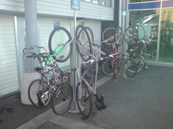 Keywords: Vertical Bike Parking Racks, Ferry Terminal.jpg en Bike parking with vertical setup at the Auckland Ferry Terminal 2011-08 own Ingolfson other versions cc-zero Bicycle racks in New Zealand Auckland Ferry Terminal
