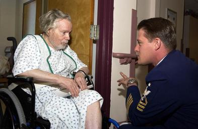 | Keywords: VETERAN VISITS DVIDS1072688.jpg en NEW YORK New York Nov 8 2002 --Senior Chief Weiller of Coast Guard Activites New York vists with 80-year old U S Army Veteran William Johnston at the 23rd street Veterans Medical Center Military members from the Coast Guard and Navy visited hospitalized veterans along with 30 students from Queens District 28 delivering Veterans Day cards in support of Operation Thank a Veteran The Coast Guard and School District 28 have delivered more than 15 000 cards to New York City Veterans for the last three years USCG photo by PA1 Tom Sperduto 2002-11-08 Petty Officer 1st Class Thomas Sperduto https //www dvidshub net/image/1072688 1072688 2013-12-11 15 48 NEW YORK NY US PD-USGov Veterans Day Images from DoD uploaded by Fæ |