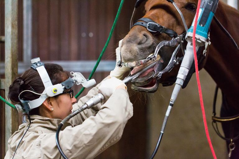 Keywords: veterinarian woman doctor specialist horse tooth treatment grinding drilling hand labor clasp bridle medical veterinary medicine head lamp gloves anesthesia files dremel magnifying glass tool mobile reitstall pony sport horse intervention outpatient
