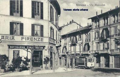 Keywords: Il tratto iniziale di via Morosini che conduce alla stazione delle Ferrovie dello Stato, a sinistra il caffè Firenze (poi Regina). tram varese