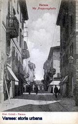 Keywords: Vista su via Pozzovaghetto (ora Volta) e su via Manzoni. In fondo un tram proviene da piazza Mercato (ora Repubblica). varese tram